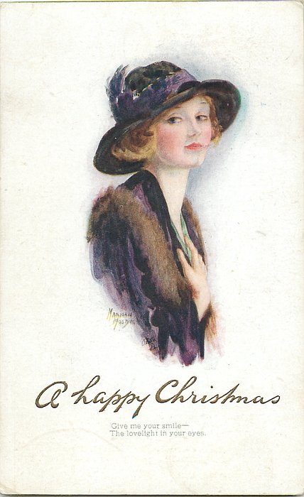 verse:- GIVE ME YOUR SMILE- THE LOVELIGHT IN YOUR EYES., come opt. in gilt A HAPPY CHRISTMAS this image used for advertising to Spanish speaking customers SAES CARLSBAD EVANS