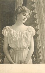 woman wearing white dress with applique, she faces front, looks down and right