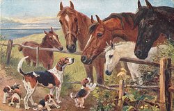 three horses and two foals, brown, black, white fox-hound with four puppies
