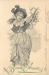 girl in old style dress holds skirt with right hand and mistletoe branch with left hand