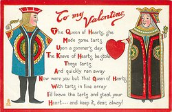 TO MY VALENTINE THE QUEEN OF HEARTS, SHE MADE SOME TARTS UPON A SOMMERS DAY. THE KNAVE OF HEARTS HE STOLE THOSE TARTS AWAY// ALWAY!