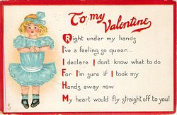 TO MY VALENTINE RIGHT UNDER MY HANDS I'VE A FEELING SO QUEER...I DECLARE I DON’T KNOW WHAT TO DO FOR I'M SURE IF I TOOK MY HANDS AWAY NOW MY HEART WOULD FLY STRAIGHT OFF TO YOU!
