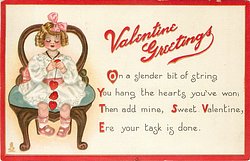 VALENTINE GREETINGS ON A SLENDER BIT OF STRING YOU HANG THE HEARTS YOU'VE WON; THEN ADD MINE, SWEET VALENTINE, ERE YOUR TASK IS DONE.