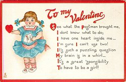 TO MY VALENTINE SEE WHAT THE POSTMAN BROUGHT ME, I DON'T KNOW WHAT TO DO; I HAVE ONE HEART INSIDE ME--I'M SURE I CAN'T USE TWO! IT'S A PUZZLING// GIRL!
