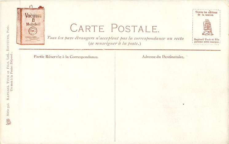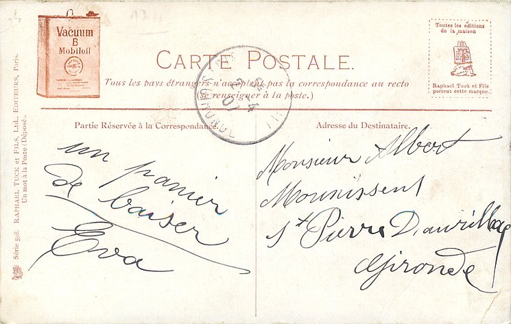 UN MOT A LA POSTE, (DEPOSE), same image English back OILETTE CONNOISSEUR 2709 FLASHING MOTORISTS Dell'Aquila E.4, come with VACUUM B MOBILOIL ad. on back & silver oilcan on front