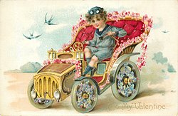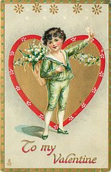 TO MY VALENTINE boy in green carrying lilies-of-the-valley stands in front of gilt heart