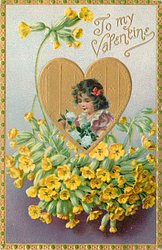 TO MY VALENTINE insert of girls face in gilt heart, yellow primroses below