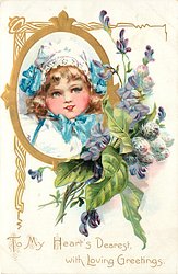 TO MY HEART'S DEAREST WITH LOVING GREETINGS girls face insert, gilt border, flowers right