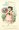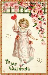 TO MY VALENTINE girl in pink holding pot of pink roses stands in front of gilt heart