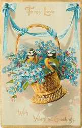 TO MY LOVE WITH VALENTINE GREETINGS two tits sit in basket of forget-me-nots, blue ribbons