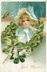 WITH FOND AFFECTION girlin white framed by wreath of 4 leaf clovers & lilies-of-the-valley