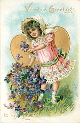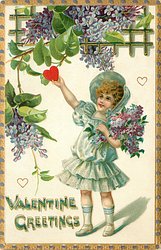 VALENTINE GREETINGS girl in light blue dress, carrying lilac, holds heart up to lilac above