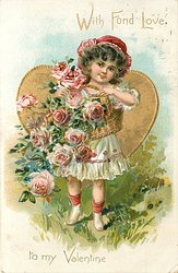 WITH FOND LOVE TO MY VALENTINE girl with basket of pink roses in front of gilt heart