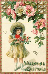 VALENTINE GREETINGS girl in cream dress looks down at armful of flowers, dog-roses above