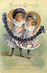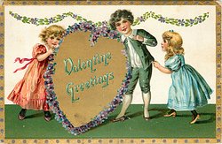 VALENTINE GREETINGS in front of gilt heart, bordered by violet flowers, 3 children