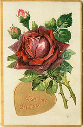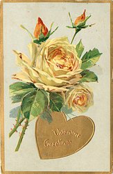 VALENTINE GREETINGS in gilt heart below yellow roses
