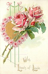 WITH LOADS OF LOVE gilt heart bordered with pink roses, two large pink roses stems left