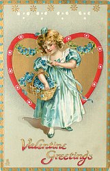VALENTINE GREETINGS girl in blue dress stands in front of gilt heart bordered in red, holds basket of blue forget me nots
