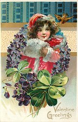 VALENTINE GREETINGS girl in red coat, white muff, framed by circlet of violets
