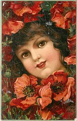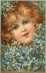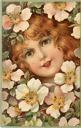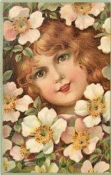 girl's face surrounded by five petal pink/white roses, girl looks to right