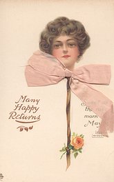 comes opt. in brown MANY HAPPY RETURNS with silk bow applique