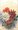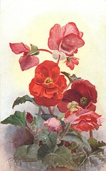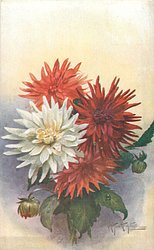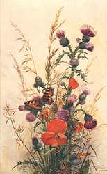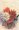 purple michaelmas daisies with yellow centres, surrounded by red/orange leaf sprigs