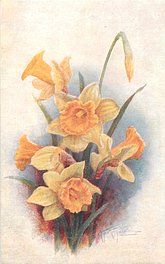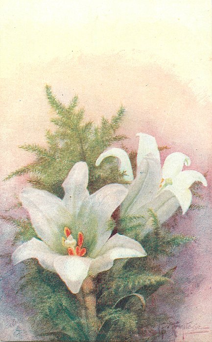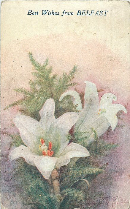 come opt. in green A HAPPY EASTERTIDE in scroll MAY ALL THINGS FAIR AND SWEET UNITE TO MAKE YOUR EASTER GLAD AND BRIGHT or in blue BEST WISHES FROM BELFAST