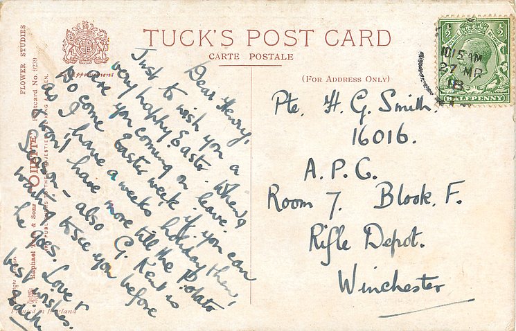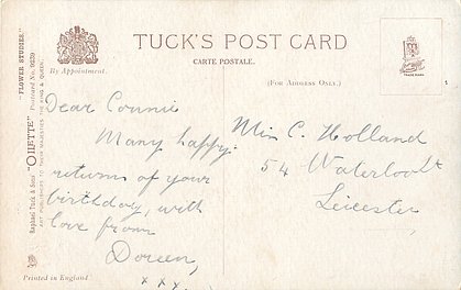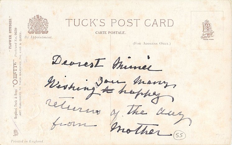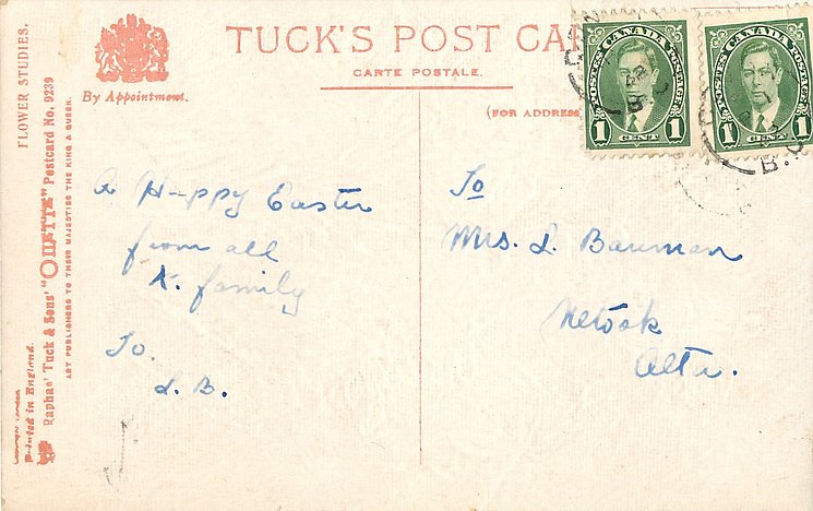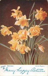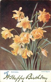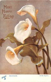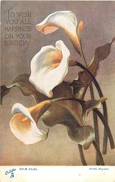comes opt. in red MANY HAPPY RETURNS, in gilt EASTER GREETINGS, in black TO WISH YOU ALL HAPPINESS ON YOUR BIRTHDAY, TO WISH YOU A BRIGHT AND HAPPY EASTER, in purple E. A. SHEPHERD ARUM KNOWN AS CALLA LILIES