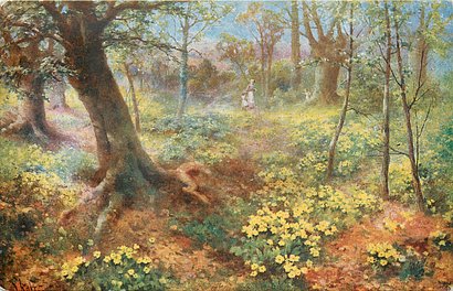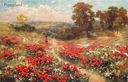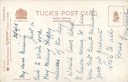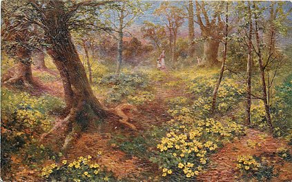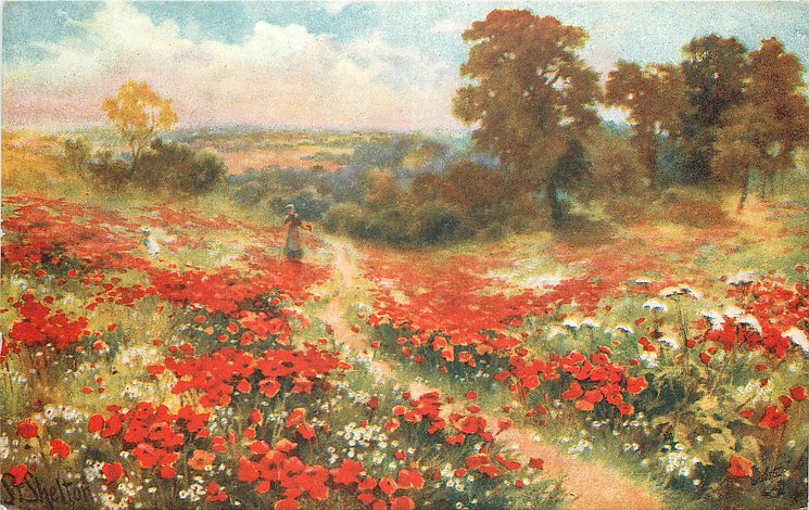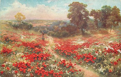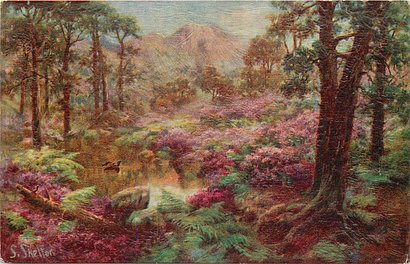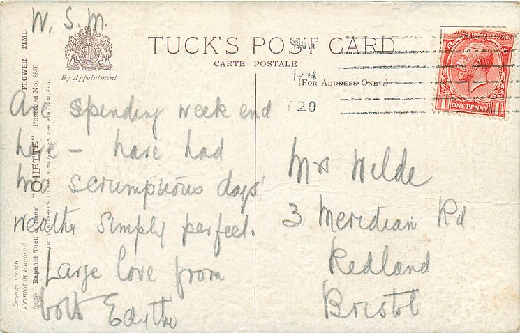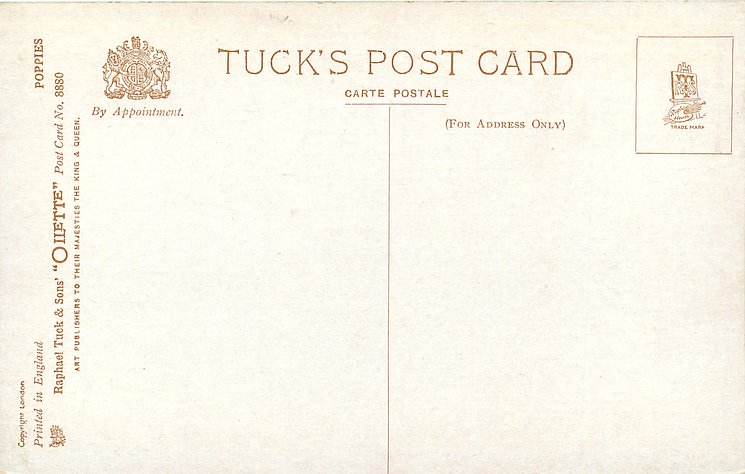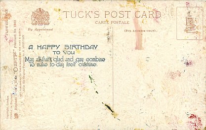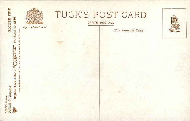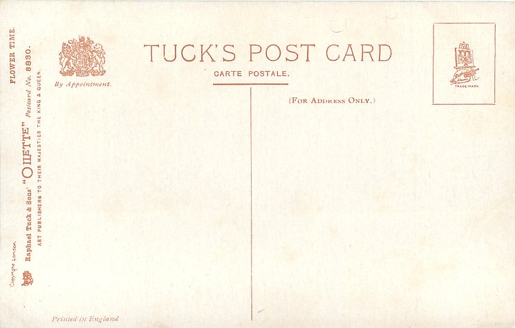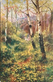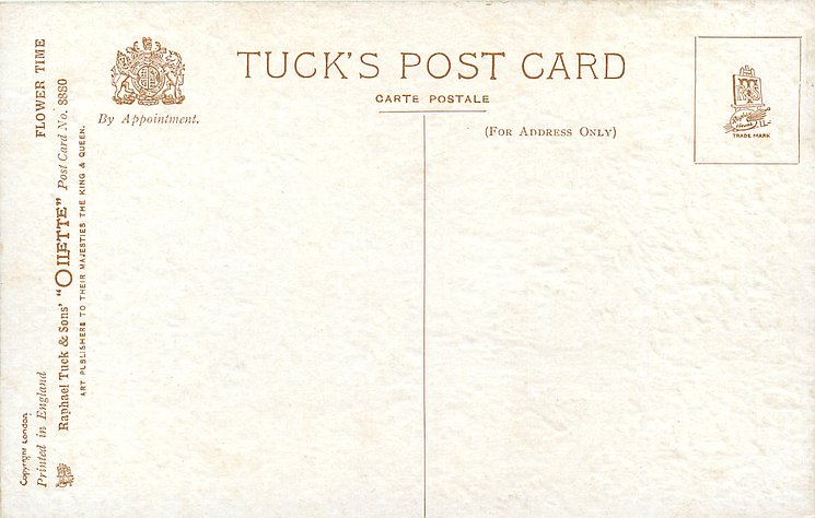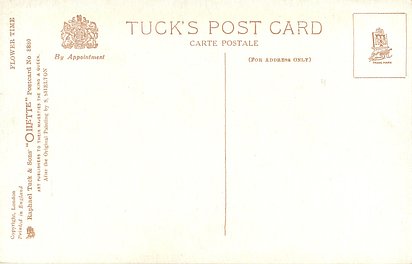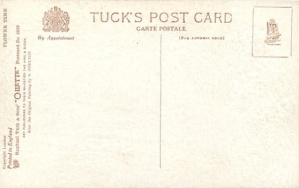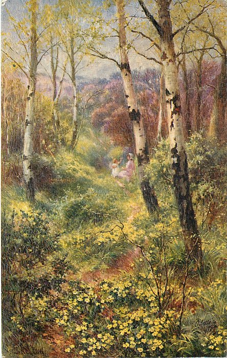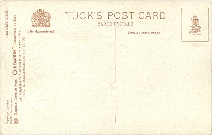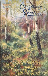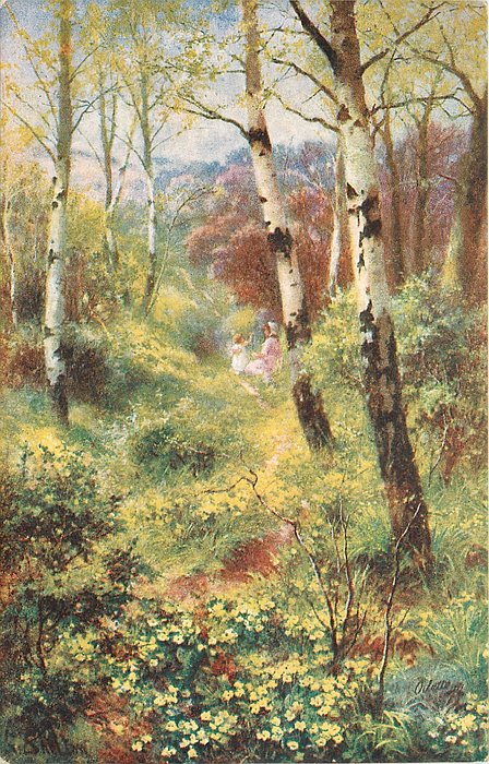 4 backs, same image 3602 WOODLAND WALKS, OILETTE or OILFACSIM (O.F. prefixes) or o/f (not so trade named), come with AMERICAN Y.M.C.A. ad on front, come with greetings & verse on back, listed in 1926/1927 POSTCARD catalogue