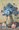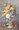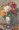 blue cornflowers in blue/white/yellow vase, roses around on carpet