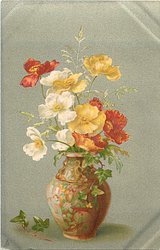 golden vase center with orange, white and yellow poppies, sprig of ivy on table next to vase