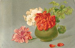 small round green vase with white, red and pink geraniums & leaves