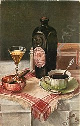 liquor bottle in front of a cigar box, drink, cigar in ashtray and cup of coffee with cigarette in saucer