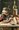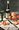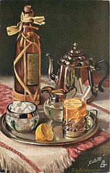 liquor bottle sitting beside silver coffee pot, silver plate holds a drink, lemon, sugar bowl, creamer