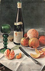 wine bottle, butter knife, glass, five fruit on plate, cork behind bottle, orange peeled