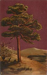 big tree in the middle, bush left, hill behind