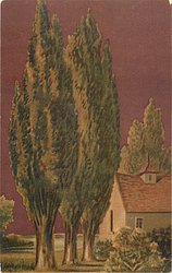 three big trees middle/left, house right