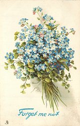 blue forget-me-nots in a bunch with string tied around bottom, leafy foliage included, stems right
