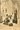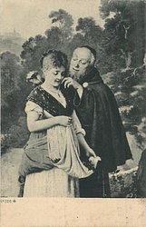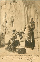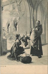 monk standing by church portal accepts offering of dead chicken from kneeling pretty girl