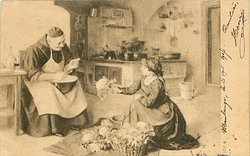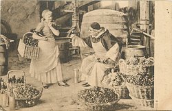 monk seated in cellar amongst baskets of cherries toasts pretty girl carrying basket of bottles