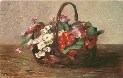basket of red, pink & a few white polyanthus