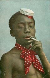 young black man with tiny white cap and white spotted red tie, smoking unlit cigarette