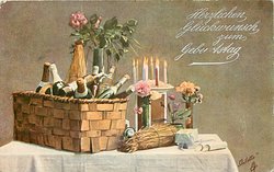 basket of sausage, hyacinths, candles, parcels, rabbit, grouse, arranged on table