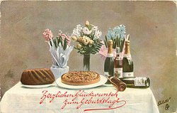 pots of blue & pink hyacinths on either side of vase of white flowers, 2 uncut cakes, wine bottles right on table