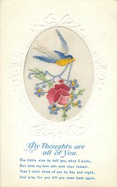 verse:- I'VE LITTLE ELSE TO TELL YOU, WHEN I WRITE, BUT THAT MY LOVE WILL EVER TRUE REMAIN. THAT I SHALL THINK OF YOU BY DAY AND NIGHT, AND PRAY FOR YOU TILL YOU COME BACK AGAIN.