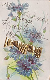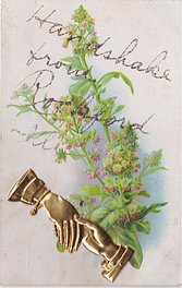 A HAPPY BIRTHDAY BE YOURS, comes glittered HANDSHAKE FROM ... with or w/o gilt handshake charm applique comes opt. in gilt GREETINGS FROM NEW CITY N.Y.