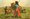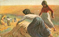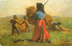 woman walking carrying hay, two men rolling hay and one woman bent over in background