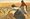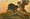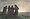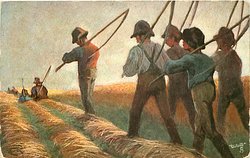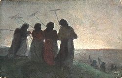 five men on hill carrying scythes walk away towards two over the brow of hill
