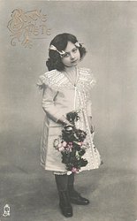 girl in white coat stands facing slightly right looking front holding bunch of flowers & evergreen