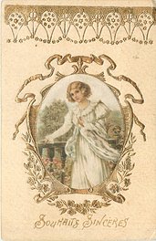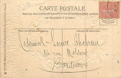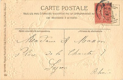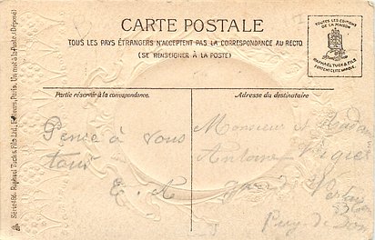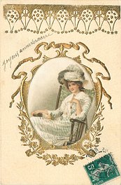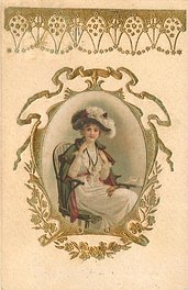gilt embossed elaborate nouveau gilt decoration around oval silk insets, UN MOT A LA POSTE, (DEPOSE)